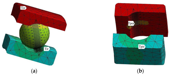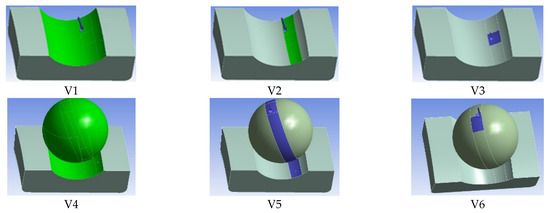 The author’s own research [17] shows that the contact areas resulting mainly from contact deformations of the ball and raceway may have different forms and dimensions (Figure 2b,c) than the default one (Figure 2a). This situation may alter the conditions of heat conduction between the balls and raceways. Therefore, the author conducted simulation studies of heat distribution in the bearing for several forms of the contact areas of the ball with raceways. These characters are the same as the areas coded with symbols V1–V6.