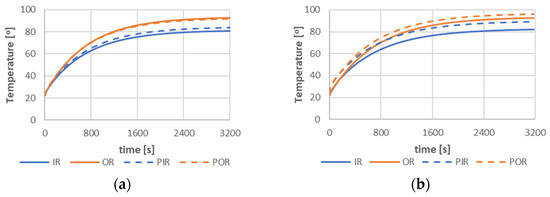 Comparing the temperature courses from the simulation tests with the course from the experimental tests in Figure 14a, one can formulate an opinion about their compliance, first of all qualitative. The temperatures on the outer and inner rings differ in the steady state by approx. 10 °C, and the time to reach the steady state is approx. 1 h. On the other hand, quantitative differences are noticeable, i.e., the temperatures from the experimental tests in the steady state are slightly lower than those from the simulation tests. In contrast, in the transition state for the outer ring, it is significantly different in the first 1000 s.