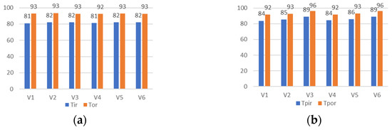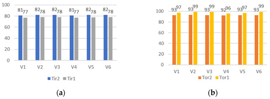 Temperatures in the steady state for two values of the quotient of the area with free and forced convection: (a) for the inner ring, (b) for the outer ring, for six variants of heat sources V1–V6; Tir2, Tor2—for the quotient 2, Tir1, Tor1—for the quotient 1.