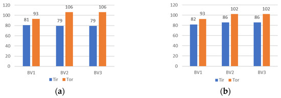Comparison of temperatures on the inner (Tir) and outer (Tor) rings for three different contact areas: (a) heat sources V1, (b) heat sources V3; BV1, BV2 and BV3—designation of Bonded contact models for contact areas corresponding to variants V1, V2 and V3.