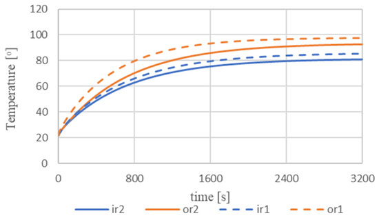 Examples of temperature courses on the inner and outer rings for two variants of convection: for the area quotient with free and forced convection 2 and 1; ir2, or2—inner and outer ring for the area quotient 2, ir1, or1—for the area quotient 1.
