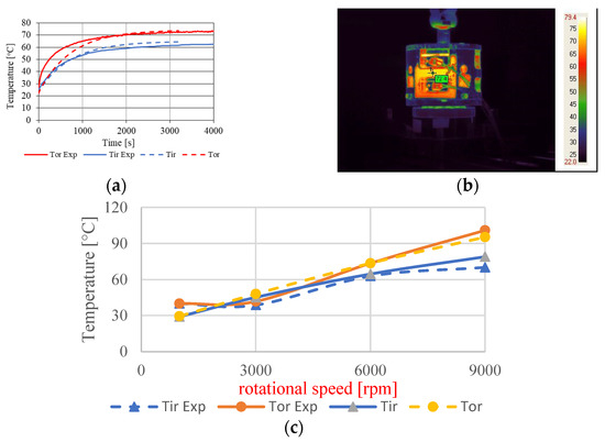 Examples of experimental and simulation curves of the temperature of the outer and inner rings: (a) time course, (b) image from a thermal camera, and (c) the effect of bearing speed; TirExp, TorExp—experimental results, Tir, Tor—simulation results.