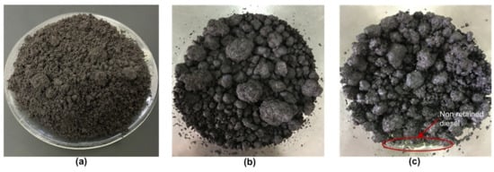 During this curing period, the contaminant could distribute throughout the soil and react with the pore fluid to achieve ionic stability []. After the curing period, the sample was visually inspected to verify if the soil could retain the added diesel. This process was repeated by increasing the diesel concentration (i.e., 4%, 8%, 12%, and 14%) until the soil could not retain more diesel.