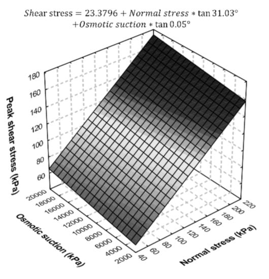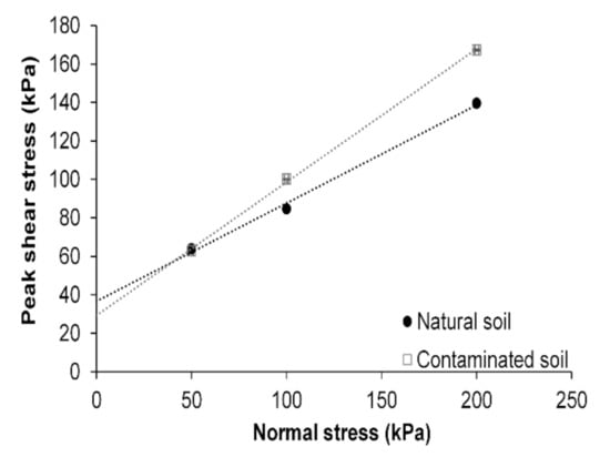 Other researchers have studied the effects of diesel [], oil [], gasoline [], and crude oil [] on the shear resistance of different clay soils, finding that soils’ cohesions tended to decrease as the contaminant concentration increased. However, while in some cases, the internal friction angle was reported to increase as the contaminant concentration increased [,], in other cases, a reduction of its value was reported as the contaminant concentration increased [,,]. These results may mean that clay minerals exhibit different behaviors according to the hydrocarbon used to contaminate the soil.