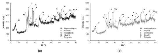 Soil samples were powdered in an agate mortar and sieved through a No. 200 sieve. The powders were characterized by X-ray diffraction (XRD Rigaku, MiniFlex) with Cu-Kα radiation ( = 1.5406 Å). Diffraction intensity, in function of , was analyzed at the interval from 2° to 80°, with a  step size of 0.02°, and a counting time of 0.06 s per point. Interplanar spaces () were evaluated by the Bragg’s law equation: