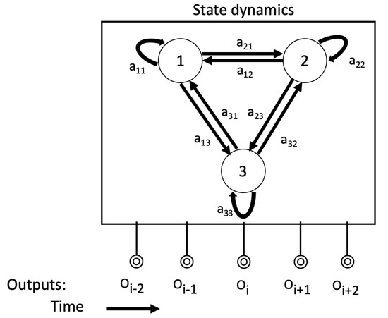 To give a formal definition of Hidden Markov models, we begin with the following notations: represents the set of N possible states in the system; is a transition matrix, where each denotes the probability of transitioning from state i to j at any given time-step; represents a sequence of observations of length T, each drawn from the set of M possible observations ; and represents the initial distribution of the system. When a system is operating in a specific state , the output at time t is generated according to a unique probability distribution denoted as , the emission probability.