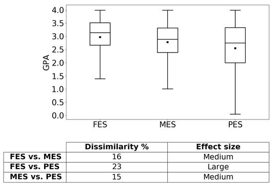 The average GPA for each strategy cluster is shown in Figure 4. To compute the average GPA, we first calculate the average cumulative GPA for each student over their semesters, and then for each enrollment strategy group, we take the average over students’ cumulative GPA in that group. Results show that the FES group has the highest average GPA (2.97). The lowest GPA corresponds to the PES group (2.55), while the MES group’s GPA (2.78) lies between PES and FES. Statistical hypothesis Games–Howell post hoc multiple comparison tests were conducted to assess if the average GPA for each group is statistically different from the average GPA of other groups. We use the Games–Howell test because it is non-parametric and does not assume homogeneity of variances (which is the underlying assumption for the ANOVA test). The test statistic p-values for all the hypothesis tests are 0, indicating that each group’s average GPA is statistically different from the others (the sample size for FES, MES, and PES is 88,319, 6,363, and 28,504, respectively). The table in Figure 4 provides an effect size categorization and dissimilarity% metric, that is the percentage by which the distribution of each group differs from each other. The relationship between dissimilarity% and the commonly used Cohen’s d metric for normal distributions is explained in Appendix A. Based on the table, the difference in GPA between FES and PES groups is more significant than the other pairs. Furthermore, the box and whiskers in Figure 4 indicate that student clusters that employ FES and MES have more consistent performance than the PES student cluster. These findings suggest that increased student engagement through full-time enrollment with the university is associated with higher academic performance. Therefore university policymakers may help students improve their academic performance by providing the necessary support and opportunities (e.g., financial aid, on-campus work) to students to better facilitate full-time enrollment.