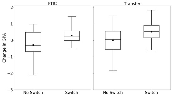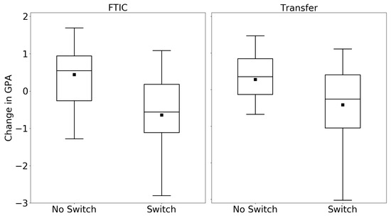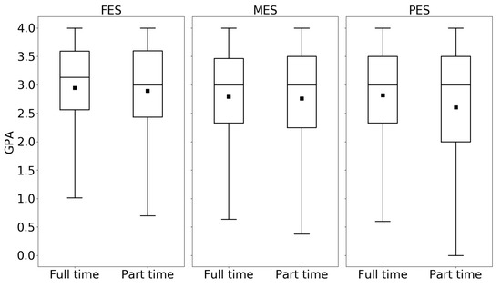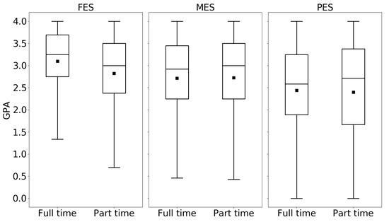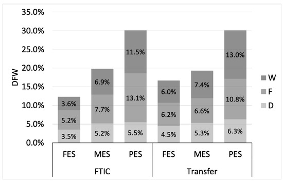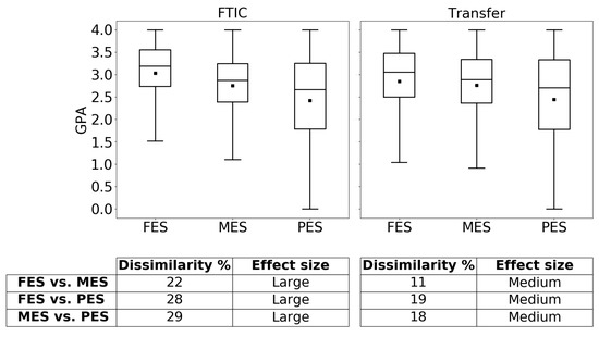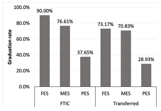 Furthermore, some comparisons were conducted between FTIC and transfer students in terms of average GPA in full-time and part-time semesters. For example, for the PES group, the average GPA for transfer students in full-time semesters is 2.81, while for FTIC students, it is 2.44. The equivalent values for part-time semesters are 2.60 and 2.40, and the differences are statistically significant. In other words, PES transfer students have a higher GPA compared to PES FTIC students for their full-time and part-time semesters. These results may seem counter-intuitive, but it might be explained by the academic history of transfer students. The students transferring from community colleges may be acclimated to maintaining part-time jobs and, therefore, enrolling in part-time semesters, which explains them maintaining reasonable academic performance in part-time semesters [45].