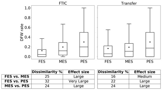 As another indicator of students’ performance we compare the DFW rate for students with different enrollment strategies. The DFW rate is defined as the number of courses with D, F, and W grades over the total number of courses taken by a student. Appendix B shows an example of computing the DFW rate. Whisker plots for DFW rates separated by FTIC and transfer students are provided in Figure 8. As expected, for both FTIC and transfer students, the PES group is the most likely to get DFW grades, followed by MES and FES, respectively. Games–Howell post hoc multiple comparison tests were conducted to see if the average DFW rates of each group differ from other groups. For both FTIC and transfer students, the p-values of the tests for all possible pairs between FES, MES, and FES is 0, which means the difference is statistically significant (For FTIC students, the sample size of FES, MES, and PES groups is 39,371, 578, and 596, respectively, and for transfer students, the values are 31,721, 4515, and 18,521, respectively).