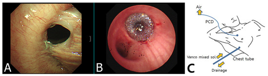 Considering the poor general condition of the patient and the state of malnutrition, we closed the BPF using an Amplatzer via fiberoptic bronchoscopy (Figure 1B). Methicillin-resistant Staphylococcus aureus (MRSA) was detected in the pleural fluid collected from the chest tube during the four days after Amplatzer placement. The infected pleural space was sterilised by irrigation via a chest tube using vancomycin solution (200 mL of normal saline 0.9% with 1 g of vancomycin). It took two months to eradicate the MRSA using this treatment strategy. During irrigation, an arrow catheter was placed at the third intercostal space of the midclavicular line to vent the intrathoracic air for a sufficient influx of solution (Figure 1C). The concentration of vancomycin in the pleural fluid and serum collected 6 h after an antibiotic solution irrigation was measured using therapeutic-drug monitoring. The serum concentration of vancomycin was consistently within the therapeutic range, and was recorded at 15.88 mg/dL and 18.15 ug/mL on the 40th and 45th day after Amplatzer deployment, respectively [3]. The pleural concentration of vancomycin was 27.76 µg/mL and 22.41 µg/mL on the 40th and 45th day, respectively, which was higher than the serum concentration. This vancomycin concentration was predicted to maintain over trough level. Three sessions of irrigation using video-assisted thoracic surgery and an an antibacterial solution containing vancomycin were performed.