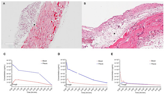 (A) H&E-stained histological section of the normal pleura; (B) H&E-stained histological section of the inflamed pleura by viscum injection; (C) Vancomycin concentration in pleura and blood with normal pleura after injection via pleura; (D) Vancomycin concentration in pleura and blood with thickened pleura after injection via pleura; and (E) Vancomycin concentration in pleura and blood with thickened pleura after injection via blood. * parietal pleura.