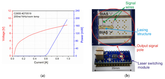 A compact laser modulator was built using a laser switching high-speed iC-G30 iCSY HG20M module (iC-House Corporation, Bodenheim, Germany) and a laser structure designed at the Institute of Electron Technology (Warsaw, Poland) [26,27]. The module is equipped with six channels, providing a speed of up to 250 MHz, current pulses of up to 5 A (per channel), and an output voltage of 30 V. Its main capabilities are independent and simple voltage control of channel currents, parallel channel operation of up to 6 A (constant mode) and up to 30 A (pulsed mode), and thermal shutdown. The QC laser was designed to operate at room temperature. Its parameters and construction mean it can be mounted directly on the signal pole of the laser switching module without the need to use an extra cooling unit. The optical power and voltage vs. current characteristics of the laser and a picture of the integrated modulator are presented in Figure 1.