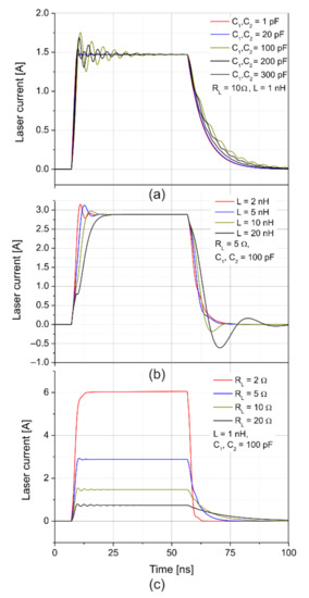 A simulation of the light device was performed for different lasing structure electrical parameters (Figure 3). The reactance parts of load impedance did not influence the pulse amplitude (Figure 3a,b). The capacitances generate some oscillations at the pulse rising edge caused by feedback signals conditions. Growing these capacitances, the response time constant also increases. The most critical issue is load inductance, considering pulse shape and its oscillations. We observed a slower modulator response and current high-level changes for both biasing ranges. A current-voltage dependence for the inductor and signal resonance conditions defined these effects. Even at the rising and falling parts of the pulse, these signal fluctuations can be the critical point for the current amplitude, causing, e.g., laser structure damage. The bonding pad capacitance is an almost ideal plate capacitor with a PTFE dielectric [31]. For inductance, the bonding wire generally is 1 nH/mm. However, all of these parameters vary from laser to laser. To reduce pulse degradation, i.e., overshoot and ringing, any unnecessary hardware between the switching unit and the laser must be avoided. That is why the laser’s direct and short connection to the electronics is preferable [32].