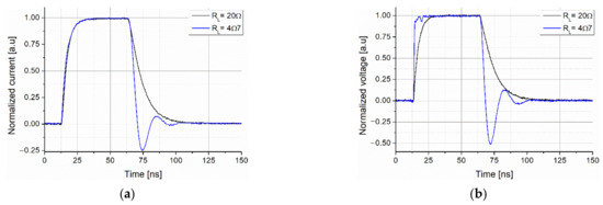 We observed both voltage and current oscillations at the falling slope for low load resistance. Impedance mismatching caused the transmission and reflection effects in the signal line. An increase in load resistance allowed for the minimizing of these effects with the limited bandwidth.