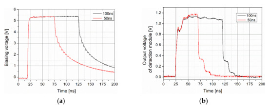 Figure 6 presents some shapes of the registered voltage signals and radiation pulses for different pulse time durations at a frequency of 1 MHz. The voltage signal came ~5 ns faster than the light one, and the laser biasing voltage limited its amplitude. It agrees strongly with the data described in [28].