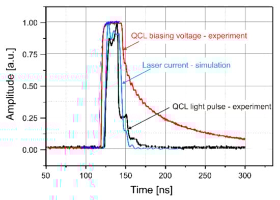 Some virtues of the experimental and simulation results are shared, e.g., inflection in the rising slope, oscillations at the top signal, and some peaks at the falling edge (Figure 7). These effects were not registered for the tests with resistances, indicating that their source is a powered laser structure. This is a new aspect for analyses of QC laser module construction for applied science. Experimental results of laser biasing voltage and light pulse also defined the time delay of ~5 ns. This phenomenon was analyzed during modulation simulations.