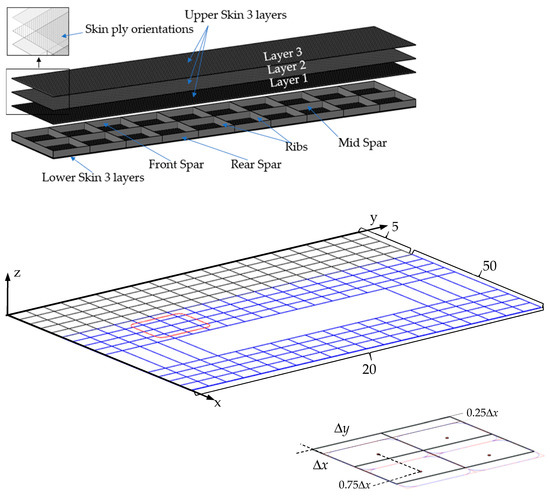 Aircraft wing structural analysis for both static and dynamics are handled by finite element analysis (FEA), which uses quadrilateral Mindlin shell elements. Aerodynamic analysis is solved using the unsteady vortex lattice method (UVLM) [22], which is known to perform quickly with moderate competency when compared with computational fluid dynamics (CFD), and various forms of potential flow analysis. Aeroelastic analysis needs a surface spline interpolation technique to interface between structural and aerodynamic forces. Reduced order modeling UVLM in the form of a discrete-time aeroelastic model of an aircraft wing has been proven efficient in the analysis of flutter speed for low speed aerodynamics [22]. In reliability-based design optimization as mentioned causes computation burden due to the complexity in analysis of models and uncertainty quantification. The complexity can be alleviated by improving uncertainty quantification using the proposed method in of the non-probabilistic group and reduce the complexity in structural and aeroelasticity analysis. A quasi-steady aerodynamic approach is used for flutter analysis, which gives satisfactory computational results compared to commercial software [14]. The aerodynamic grid on main body wing and wake is presented in Figure 2. Each element panel has chorwise length ∆x and spanwise width ∆y. The element panels and the relative placements of vortex ring elements are shown as the enlarged view. The main body wing consists of 5 chordwise and 20 spanwise panels, while the wake sheds from the tailing edge for 50 chordwise panels. The structural mass is an objective function as fuel saving is needed for modern aircraft. It is even more advantageous since it results for the moment of inertia in directional/lateral activation to reducing. Flutter speed is assigned as a constraint function to handle aircraft structural performance. The lift effectiveness is prescriptive that the wing still has available aerodynamic effective appraisal when consideration of flexibility. The last constraints are added to assure for necessary safety in operating conditions.