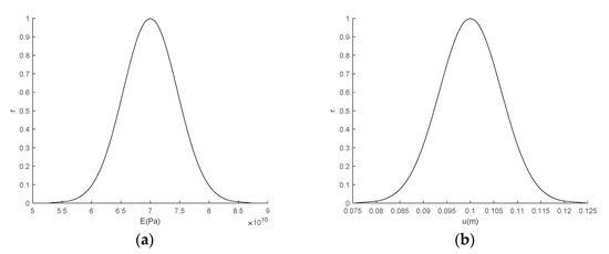 Normal membership functions of (a) Young’s modulus (E) and (b) allowable transverse displacement (u).