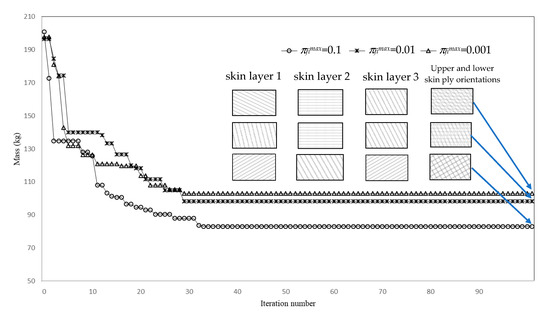 As exposed by Table 2, the total mass of the aircraft wing structure has an increasing trend with the allowable PSI πfimax being reduced from the value of 0.1 to 0.001. Meanwhile, the critical speed increases with the allowable PSI πfimax being reduced, and the lift effectiveness decreases with the allowable PSI πfimax reducing. Figure 4 demonstrates the comparison of search history for πfimax = 0.1, 0.01 and 0.001, respectivelyand presents the upper and lower skin ply orientations. When running TLBO for solving the problem, the iterative procedure stops when the number of iterations reaches 100. It equals termination iteration 200 due to the nature of TLBO, which has embedded teaching and learning phases. The results in Table 3 show the total mass of the aircraft wing structure have an increasing trend with the allowable PSI πfimax reducing. Moreover, the skin thicknesses in Layers 2 and 5 increase with the allowable PSI πfimax reducing, while the skin thicknesses in Layers 1, 3, 4, and 6—rib thicknesses and spar thicknesses approach to their lower limits. The values of the skin ply orientations between layer increases with the allowable PSI πfimax reducing. Furthermore, the results in Table 3 and the search history in Figure 4 reveal that the search history in Figure 4 are already constant before iteration 40 and that the remaining iterations do not yield significant benefits. The chosen ply thickness with increasing steps of 0.5 mm to 5 mm is not enough to bring the mass reduction as shown. The optimum thickness varies by two different thicknesses (0.5 and 1.0 mm). For future study, the step change should be reduced to 0.1 mm to provide an optimized search for a more optimum mass.