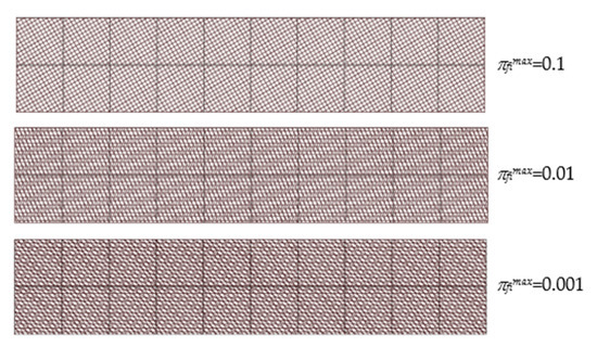 The optimum thickness varies in range from 0.5–1.0 mm, which eliminates the practical thickness. It should be more than 3 mm to maintain resistance damage [23], otherwise, the ply orientation might still change. For upper and lower skins using a laminated carbon fiber with three layers, from the calculated results, a symmetric and equivalent laminate for upper and lower skins in each PSI πfimax = 0.1, 0.01 and 0.001 with the orientations of [30°/120°/30°], [105°/0°/120°] and [150°/0°/120°], respectively as displayed in Figure 5. The optimum ply orientation can eliminate shearing and bending twist coupling behaviors.