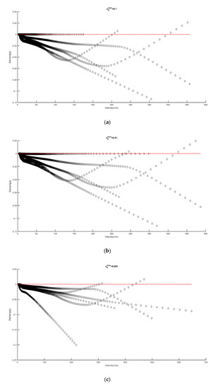 The first 10 lowest natural frequency modes used in flutter analysis at each PSI value are presented in the Table 4. From the results shown, the natural frequencies are very high for a wing—even for wind tunnel model testing. This is caused by the strict deformation constraint of 0.1 m, which is less than 2% of half the wings pan. The plots of damping ratio versus velocity with various PSI πfimax values are shown in Figure 6. The results show flutter speeds estimated by quasi-steady aerodynamics, which are affected by PSI πfimax as the lower PSI πfimax results in the lower flutter speeds.