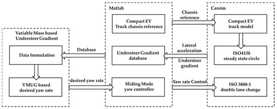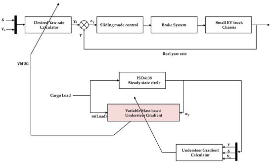 In this study, the problem of cornering stiffness was solved by mathematically formulating the change in the understeer characteristics of an EV truck according to the vehicle cargo weight. A new reference for the yaw rate was designed based on the understeer gradient and the performance was verified through the slip controller. The overall configuration is shown in Figure 1. First, the existing method of estimating the desired yaw rate is examined, and the appropriate hypotheses in various tests are confirmed through ISO 3888-1 double lane change [17]. Second, by the ISO 4138 Steady State Circle test [18], the desired yaw rate is adjusted by formulating a variable mass understeer gradient (VMUG). Third, using the VMUG formula, the movement of the vehicle with heavy loads that cannot be examined by the Steady State Circle Test is investigated. Finally, a sliding mode slip controller that performs slip control according to the tire load is designed, and the performance of the VMUG is verified by comparing with the control of various desired yaw rate references.