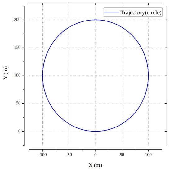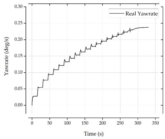 In this study, both the experimental and mathematical methods were implemented to minimize the disadvantages of the conventional desired yaw rate based on mathematical formulation. For the experimental method, the ISO 4138 Steady State Circle test, as shown in Figure 4, was applied. Within a radius of 100 m, the lateral acceleration was increased from 0 to 0.9 g in steps of 0.3 g, the understeer gradient in steady-state section was formulated, and this was used in the equation of the desired yaw rate. The vehicle was designed as a small truck with a maximum cargo weight of 600 kg. As the value of the understeer gradient changes according to the cargo weight, the desired yaw rate also changes accordingly. The desired yaw rate using constant cornering stiffness and the yaw rate changing according to the applied load are shown in Figure 5. The yaw rate data can be obtained by increasing the cargo weight from 0 to 600 kg with the center of mass at (315 mm, 2000 mm). The dimension of the cargo is set to 0.516 × 0.816 × 0.816 m, and the mass inertia of the cargo is given in Table 2.