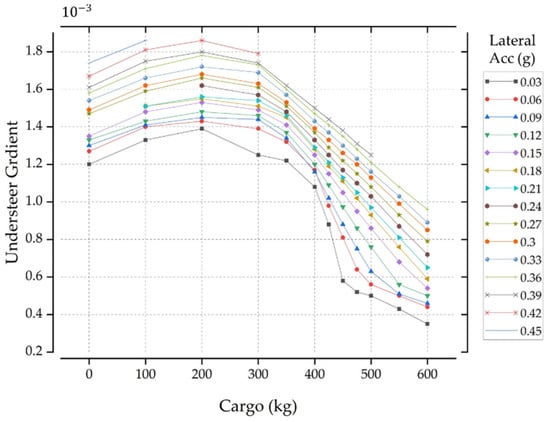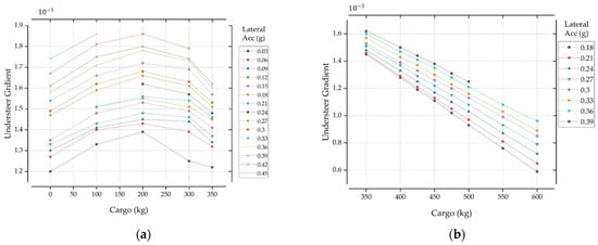 Understeer gradient values according to lateral acceleration and cargo mass are shown in Figure 6. For lateral acceleration of 0.39 g or more, the simulation did not work properly. However, two trends of the understeer gradient could be confirmed. The proposed yaw rate strategy was divided into a linear form section and a quadratic form section through an empirical method for division according to load and lateral acceleration. Each section was formulated by polynomial fitting as shown in Figure 7.