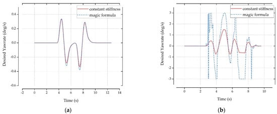 Calculated desired yaw rate of Double-Lane-Change test: (a) desired yaw rate at 60 km/h, 0.85 μ, 0 kg cargo; (b) desired yaw rate at 60 km/h, 0.85 μ, 600 kg cargo.