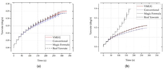 The terms c1 and c2 depend on the vehicle characteristics. From Figure 8, for general road surfaces with a low-speed driving at 60 km/h or less, it can be seen that the desired yaw rate value based on the constant cornering stiffness or Magic formula is obtained without a significant error. For vigorous vehicle movement, setting the accurate desired yaw rate is difficult in practice. In Figure 8b, it can be seen that a notch occurs for high speed and low friction double lane change with the conventional estimation method, indicating that a proper control is not possible. It can be seen that for dynamic vehicle movement, the control is difficult if an appropriate desired yaw rate is not selected.