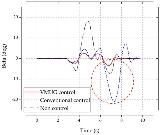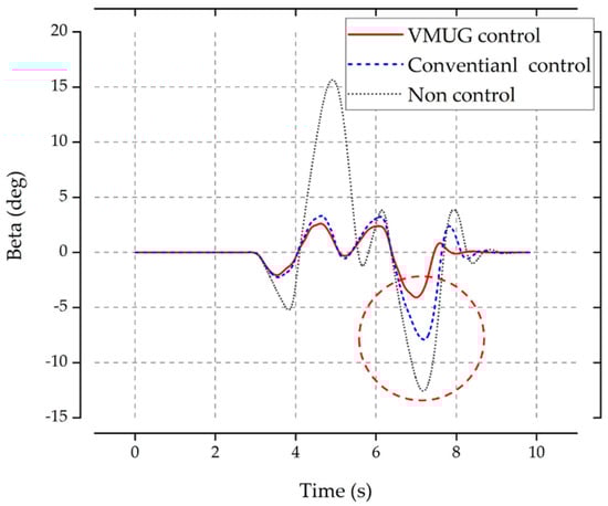 The result of the slip angle in the double lane change test with full loading of 600 kg and overloading of 1000 kg under the conditions of 80 km/h speed and μ = 0.5 is shown in Figure 11 and Figure 12. In the SMC slip control using the conventional method of constant cornering stiffness, a large slip angle is formed while returning from the second lane, rendering the control impossible. On the other hand, VMUG-based SMC slip control shows a significantly smaller slip angle. The result shows that VMUG presents an appropriate reference for robust control of vehicle stability even in the overloading condition of 40% or more.
