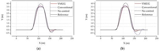 Figure 13 shows the route in the double lane change situation. Both the VMUG control and the conventional control properly follow the reference at full load. However, the conventional control shows a large path deviation corresponding to 0.75 m for the case of overload. The VMUG control deviated 0.16 m even under overload, confirming 78.7% improvement.