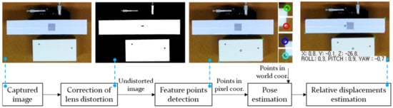 Figure 3 shows the entire process of the relative displacement estimation between the two structures using image processing techniques. The figure shows that the camera captures the image of the structures, then the camera lens distortion is corrected by using the previously calculated intrinsic parameters. From the undistorted image, the feature points of the structures, including corners, are detected by using various image processing techniques, such as binarization, and corner detection at the sub-pixel level. By calculating at least four feature point positions, 6-DOF displacement between the camera and the structures can be estimated. The relative displacement can be estimated by using the previously calculated displacements on each structure. The relative displacement between two structures, the fixed and target structures, can be estimated using the following equations: