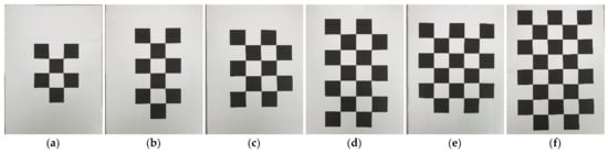 Checkerboards with (a) 3 × 4, (b) 3 × 6, (c) 4 × 5, (d) 4 × 7, (e) 5 × 6, and (f) 5 × 8 squares for the estimation of the intrinsic parameters of the vision sensor.