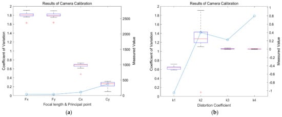 Box plot ((a) parameters of the focal length and principal points, (b) parameters of the distortion) and coefficient of variation of the estimated intrinsic parameters of the vision sensor.
