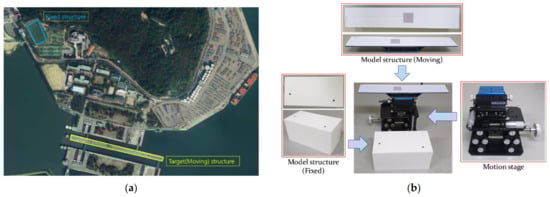 Experimental setup (a) port facilities for displacement measurement; (b) model structures and the motion stage.