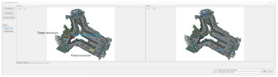 The artificial movement of the structure was generated by moving the target structure using an integrated orthophoto, and the relative displacement of the structure between two images was calculated as shown in Figure 9. The figure shows that the main displacement is predicted by the X-axis displacement, which is the longitudinal directions of the target structure. The estimated relative displacement in the test is found to be D = [−43,011.9, −825.5, 439.6, −1.2, 0, 2.6] with all units in mm or degrees. The intrinsic parameters were tuned by using GA with the specifications of the structures, which are the coordinates of feature points in the fixed and the target structures. By using the proposed method, it will be possible to determine whether to continue using the port structures by estimating the displacement before and after a disaster.