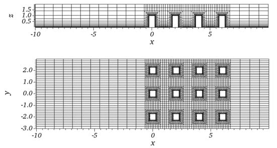 The mesh design plays a critical role in the performance of a flow simulation. As discussed above, Nek5000 is based on the spectral-element method developed by Patera [] and the considered mesh comprises a set of elements along with an eight-point GLL quadrature inserted in each of the elements. The elements are distributed uniformly in the domain with exception of the near-obstacle regions (where the element distribution is refined to provide additional resolution). Refinement is applied progressively in the wall-normal direction of the obstacles and depends upon an expansion rate that determines the level of refinement as well as the extent of the refined region. Figure 2 shows slices of the spectral-element mesh used for the flow simulation. The refinement ensures that the resolution is sufficient in the most relevant areas, i.e., the spaces between the obstacles. Note that this representation only shows the limits of the elements. Recall that within the elements, we have a GLL quadrature and thus the actual number of points is greater than what can be observed by inspecting Figure 2. We employed 70,000 elements to discretize the domain and a polynomial order , which yields a total number of grid points of around 36 million. The criteria for mesh design approximately followed the guidelines by Negi et al. [], who thoroughly validated them in the context of Nek5000 simulations of turbulent wings. In particular, these guidelines dictate that the inner-scaled mesh spacing in the turbulent boundary layer should satisfy , and . In the wakes of the obstacles, the guideline for mesh design is , where h is the local cubic root of cell volume and is the Kolmogorov scale.