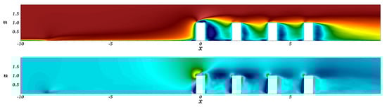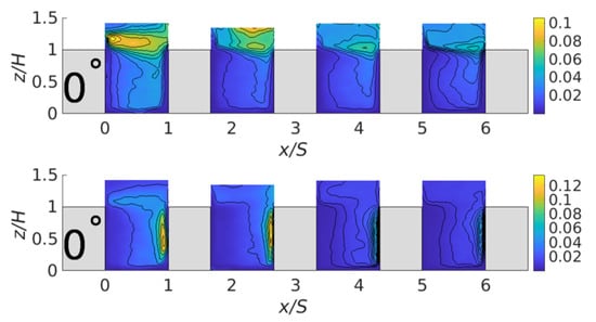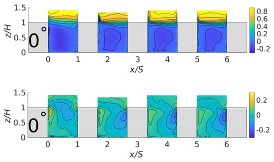 Figure 4 exhibits the evolution of the mean streamwise velocity fields at two horizontal planes located at and . As the angle of incidence of the flow is , symmetric flow is observed as may be expected, with higher velocity within the street canyons. Streamwise velocity values are higher on both sides of the first urban obstacle and then decrease as one moves downstream. The freestream flow impacts the first urban obstacle with high streamwise velocity. Then, the flow around the cubical obstacle creates a wake in which the flow separates because of the detachment of the boundary layer from the surface of the obstacle. This results in an increased pressure-drag force. Regions of reversed flow () on both sides of the first cubical obstacle indicate flow separation and they indicate the presence of the side vortices described by Sousa []. The flow impacting the other obstacles is, therefore, disturbed and turbulence is dominated by large and coherent eddies. However, a wake with separated flow downstream of each obstacle can be observed, which is also under the influence the previous obstacle wake. Closer to the wall, as shown in Figure 4 (bottom), the influence of the wall with lower streamwise velocity values can be observed. In the spanwise direction, a strong velocity gradient results in a non-dimensional streamwise velocity close to zero downstream each obstacle within the streets, with a large region of reversed flow. This region, together with the positive streamwise velocity on both sides, are indications of the presence and the location of the legs of the arch vortex.