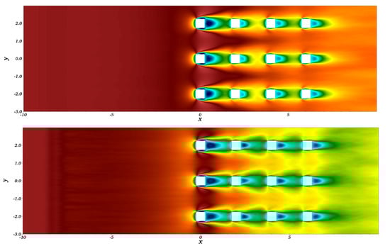 Oke [] described in 2D the structure of the flow between two urban obstacles. Two regimes of the flow were found and later described in three dimensions (3D) by Martinuzzi and Havel []. Monnier et al. [] experimentally observed these regimes denoted as the wake-interference regime and the skimming-flow regime. The wake-interference regime occurs when the canyon space between two urban obstacles is wide enough to allow the flow above the urban canopy to interact with the flow within it. On the other hand, the skimming-flow regime occurs when the space between two urban obstacles is relatively small. In this case, the bulk of the flow does not enter the street canyons and then the flow within the urban canopy does not interact with the flow from above. Experimentally, in the wake-interference regime, two recirculation regions are observed between two obstacles widely separated. The wake created by the upstream block interacts with the secondary recirculation region formed upstream relative to the downstream block and reinforced by the flow from above the urban canopy. On the other hand, when the space between two urban obstacles is smaller, only a single recirculation region is formed close to the downstream region of the upstream block. The greater part of the flow from above the urban canopy does not enter the street.