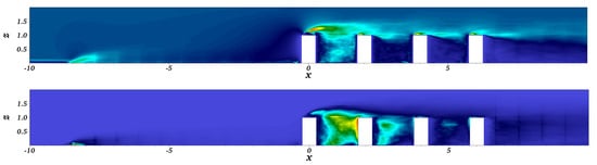 Figure 5 shows high levels of turbulence at the roof level in the first street and within the street at the upstream side of the downstream building. These high levels of turbulence suggest strong exchanges of fluid and scalar quantities between the streets and the mean flow above the urban array. Figure 5 also shows that the region of high turbulence at the upper-roof level is mainly due to the streamwise component of the velocity fluctuations, whereas, within the street, the turbulence is driven by the spanwise component. This notable energy exchange is related to the energy lost in overcoming the buildings, which is associated to the pressure drop between the windward and leeward sides of the obstacles. Note that this is in excellent agreement with the experimental results by Monnier et al. []. The wall-normal component (not shown) is not zero in those regions but is considerably weaker than the two other components. The strength of the separating shear layer near the upper-roof level decreases significantly from the first street to the following street as one moves downstream. Therefore, the exchanges of scalar quantities and fluid are considerably weaker between the urban canopy and the freestream above it. The presence of a canopy introduces new processes and, as described by Belcher et al. [] in the case of forest canopies, turbulence is dissipated by a number of mechanisms. First, eddies of all scales work against the form drag of canopy elements. Turbulence is then transferred from larger eddies to the smallest scales and therefore quickly dissipated. Secondly, viscous dissipation is the second main process that dissipates turbulence. Figure 5 shows that, within the region where the flow adapts to the urban canopy, there are regions of high turbulence intensity, but as one moves downstream this turbulence is strongly damped through the canopy. In particular, the damping of is augmented by the return to isotropy and the turbulence hence evolves into an equilibrium form. The shear layer mentioned above develops at the canopy top where the coherent eddies also form and the exchanges of scalar quantities significantly dampen in the most downstream regions since the flow from above the canopy does not enter the streets. Note that the great wealth of data produced with high-fidelity simulations can help to develop robust data-driven tools to model certain aspects of the flow and to perform predictions of the complex flow behavior observed in urban areas [,].