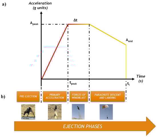 As illustrated in Figure 2, according to military standards [32,33,34] the ejection axial acceleration is schematized by means of a trapezoidal shape in the plane acceleration vs. time.
