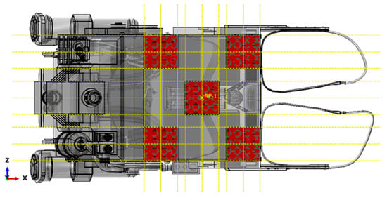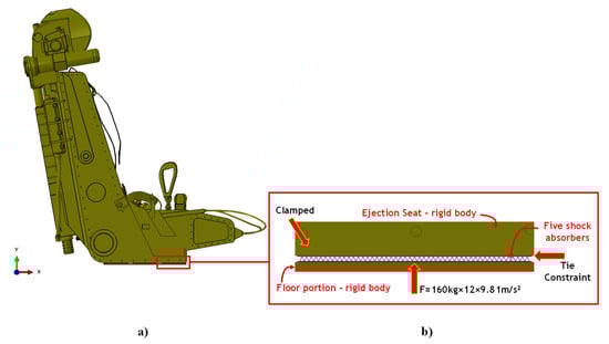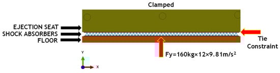 In terms of applied load for analysis, according to Figure 12, a force in positive Y-direction, of magnitude evaluated as the product between 12 g acceleration (acceleration produced by the initial explosion) and a 161.21 kg (mass of the seat–pilot absorber system), has been applied to the infinitely rigid floor portion. According to this scheme, the floor portion pushes towards the bottom of the absorbers, bonded to the bottom of the seat by tie constraints.