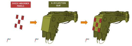 Figure 6 and Figure 7 describes the integration between the system of the five hybrid shock absorber panels and the K-39 LT ejection seat. The contact between these two parts has been defined by adopting tie constraints.