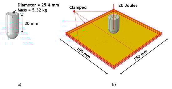 FE model used to perform the sensitivity analysis: (a) impactor dimension and mass; (b) panel dimensions and BCs.