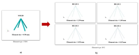 According to the conditions shown in Figure 8, four impact analyses at 20 J have been carried out where, as shown in Figure 9, four different sizes (BEAM1: 2.5 mm, BEAM2: 1 mm, BEAM3: 0.5 mm and BEAM4: 0.25 mm) of the beam elements of the lattice core have been used.