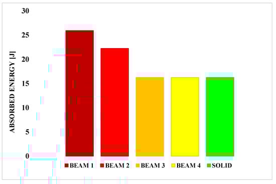 Figure 10 relates the energy absorbed to the four investigated beam configurations and by the solid configuration, while Figure 11 compares the normalised computational times of the four investigated beam configurations to the normalised computational time of the solid configuration. The computational time has been normalised by the computational time of the solid model.