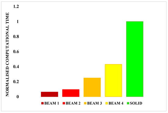 In Figure 10, it can be appreciated that the BEAM 3, BEAM 4 and SOLID configurations are characterised by extremely similar values of absorbed energy. However, as it can be read in the histogram of Figure 11, the BEAM 3 configuration shows a computation time 75% lower with respect to the one of the SOLID configurations.