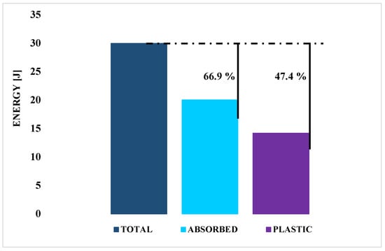 A measure of the contribution of the proposed shock absorbing system during the explosive event at the beginning of the primary acceleration phase of the ejection, can be provided by the rate of absorbed energy. Therefore, in Figure 13, a diagram that compares the total energy produced during the explosion, the total energy absorbed that is calculated as the sum of the energy absorbed through both plastic deformation and fracture of the metallic component, and the amount of plastic energy absorbed by the mechanism under investigation is provided.