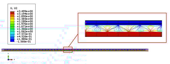 Finally, Figure 14 and Figure 15 introduce, respectively, the deformation obtained from the sandwich panel and the breakages of the metallic component, at the end of the numerical simulation.